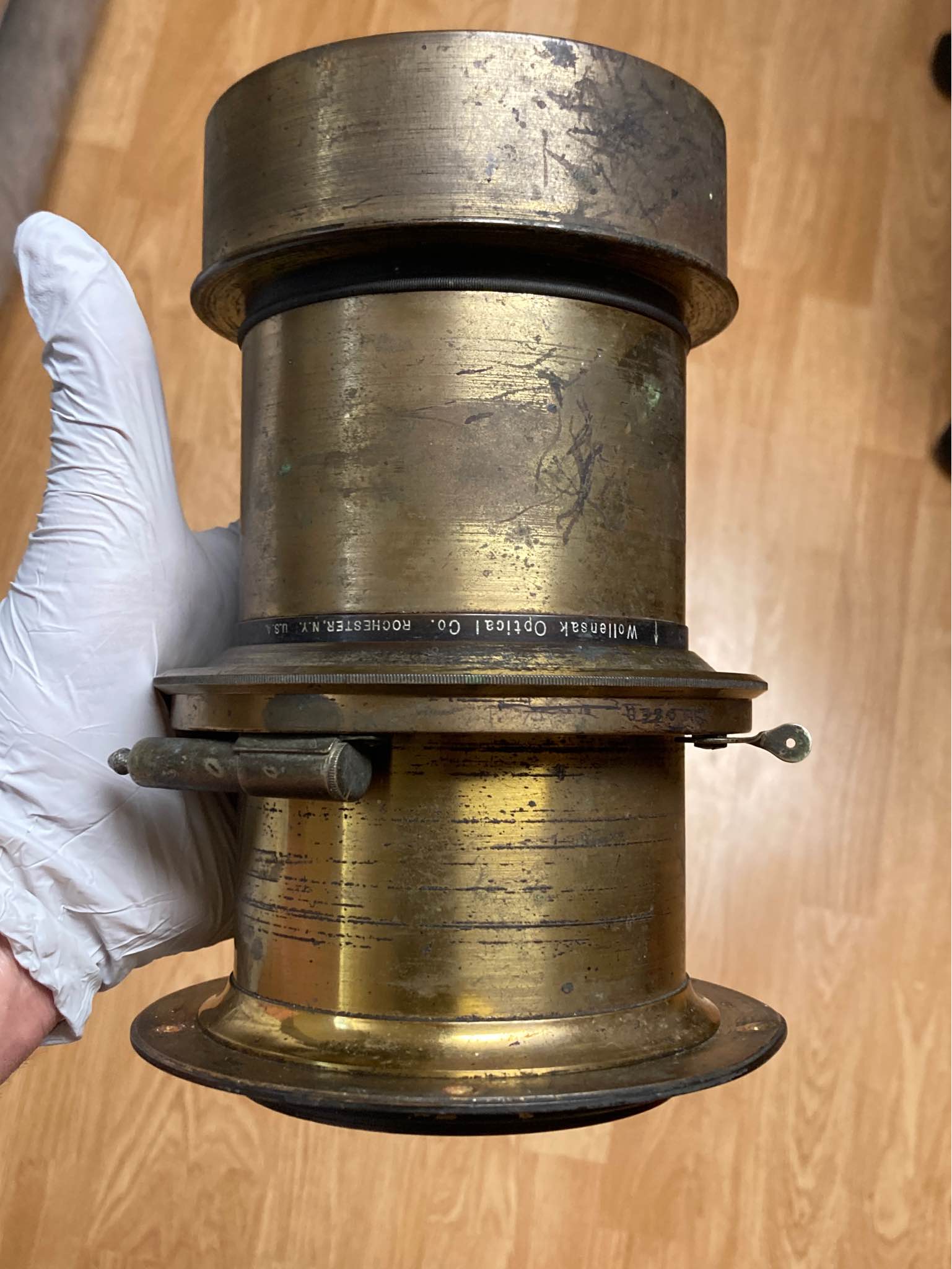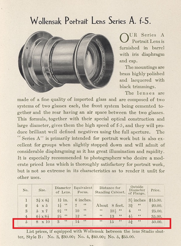 Wollensak Series A Portrait Petzval Lens f/5 for 8×10″ 14" Focal Length. Dallmeyer modified Petzval-type with curved field. Mounted in Style B Studio Shutter. The shutter is one speed