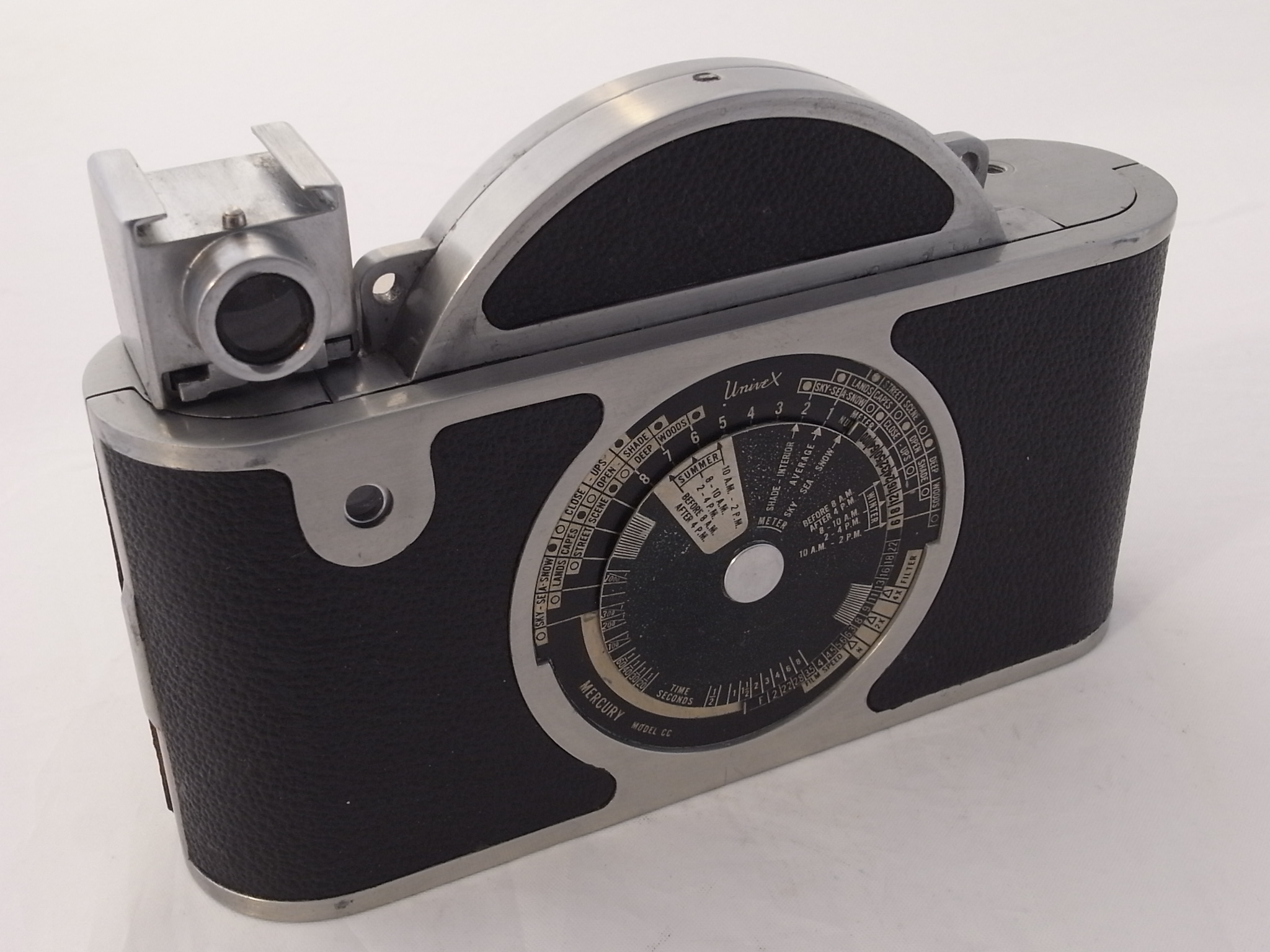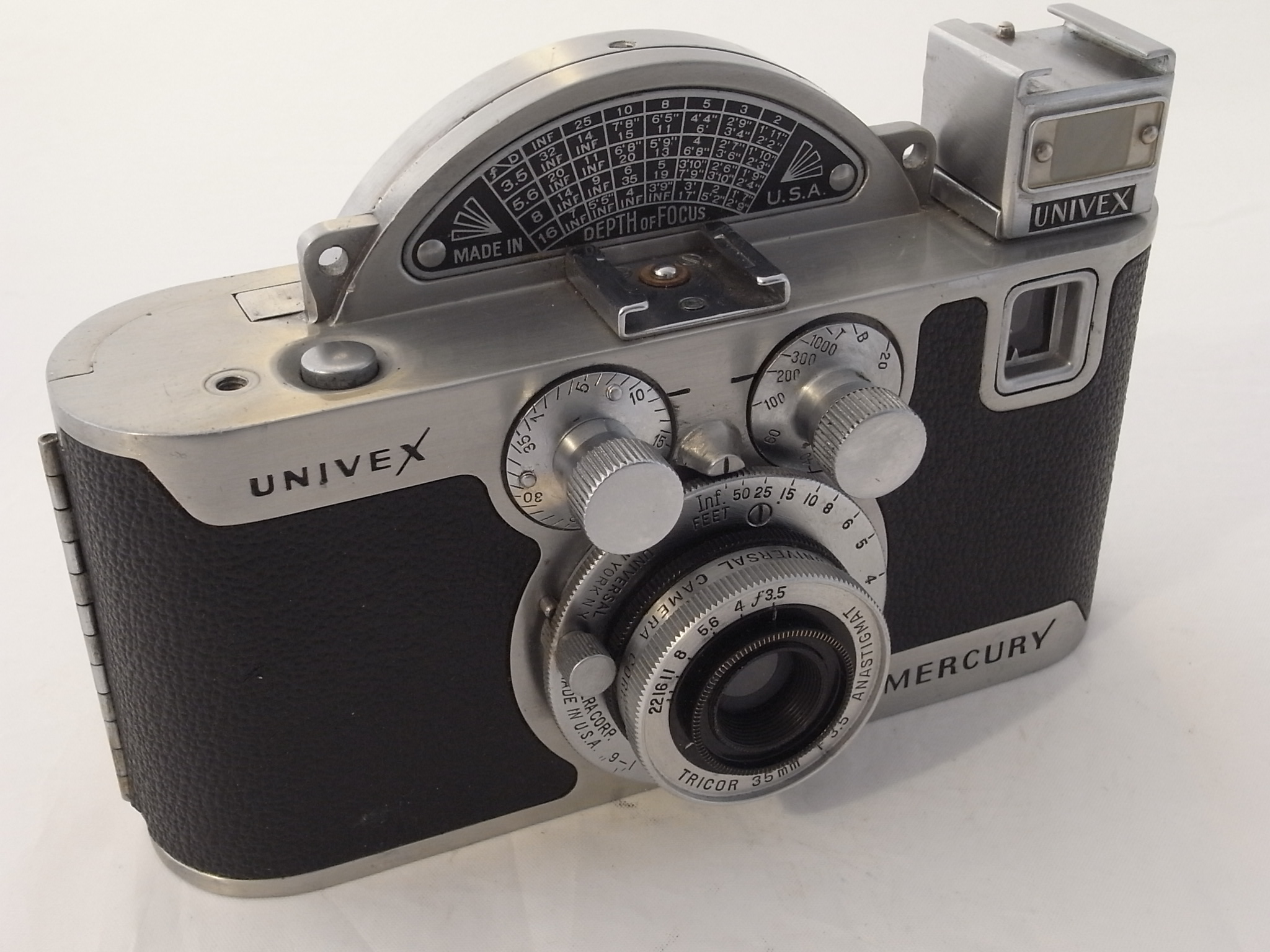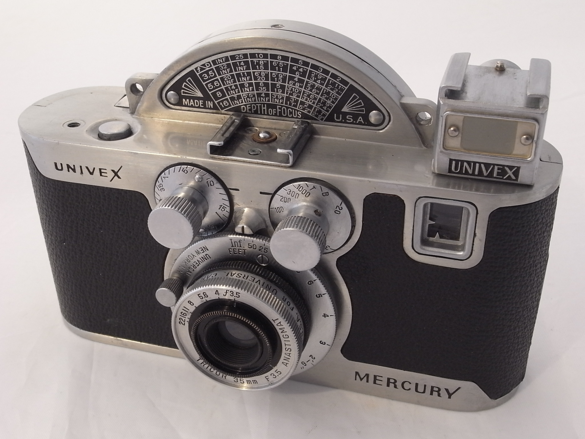 There are two major variations in Mercury cameras by Univex. The first, model CC and labeled "Mercury" on the lower front, cannot accept standard 35mm film cartridges. The other one, model CX and labeled on the front "Mercury II," was made from 1946 to 1952.The retail price was soon increased to $82.90. In comparison, my pay as a seaman recruit a few years later was $75 plus room and board. In 1951 I bought a used Mercury II for $20 in a pawn shop and used it until a tour of duty in Japan made much better cameras available at affordable prices. It functioned well, but produced only half-frame negatives, and full frame 35 is small enough. I have both models, ugly but apparently in good working condition, although I haven't run film through them. I'll let either of them go for $45 plus actual postage, guaranteed to work as designed. An interesting book on the company that produced a variety of photographic and optical items is The Univex Story by Cynthia A. Repinski, available from several online sources. It includes 23 pages on the model CC, but only 11 on the Mercury II.