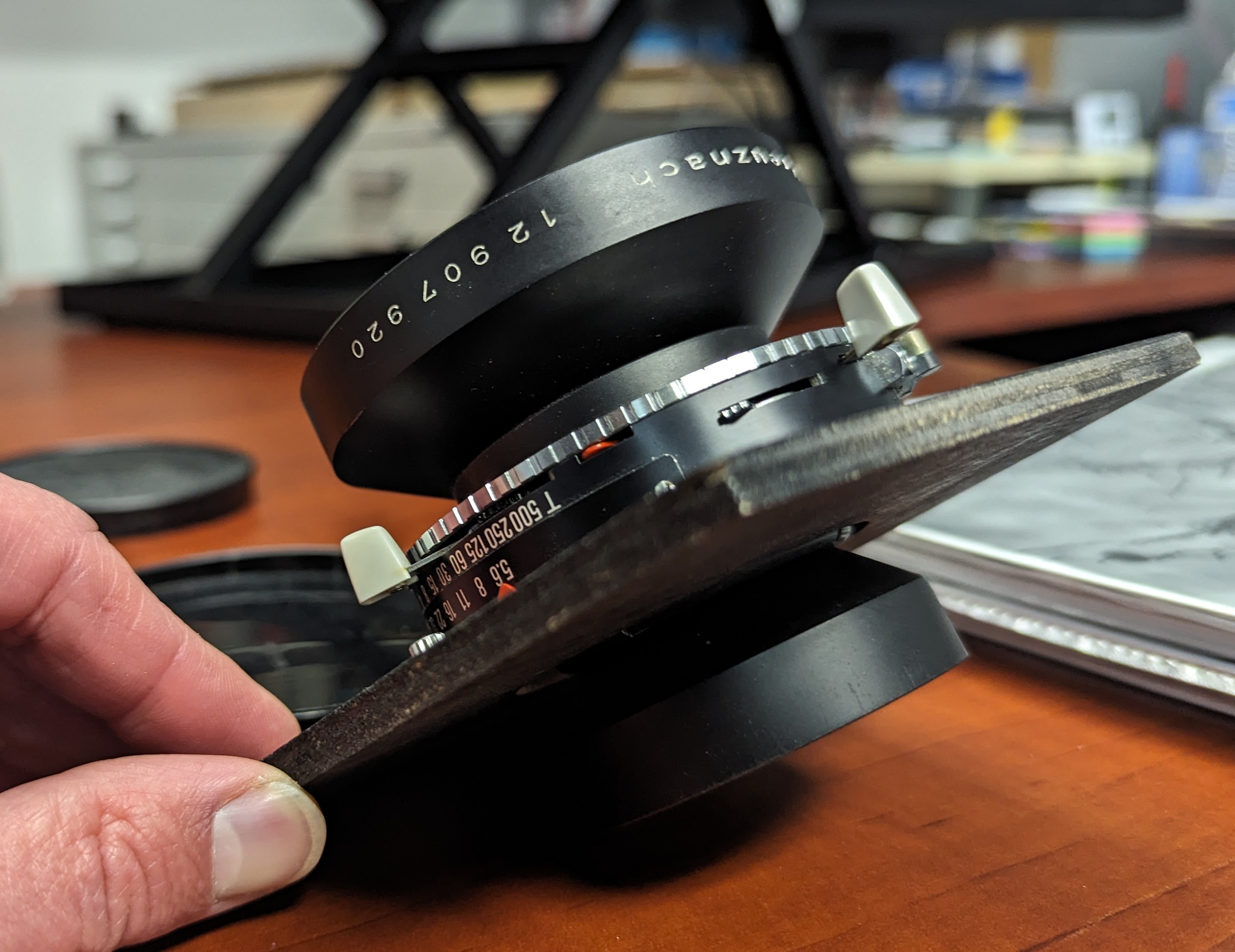 My 210 Symmar-S is in "quite nice" condition with a Compur 1 shutter that seems to be working well. Minor cosmetic flaws, minor dust inside, coatings look great. The lip of the rear cell metal surround has a minor dent. Homemade lens board not included.