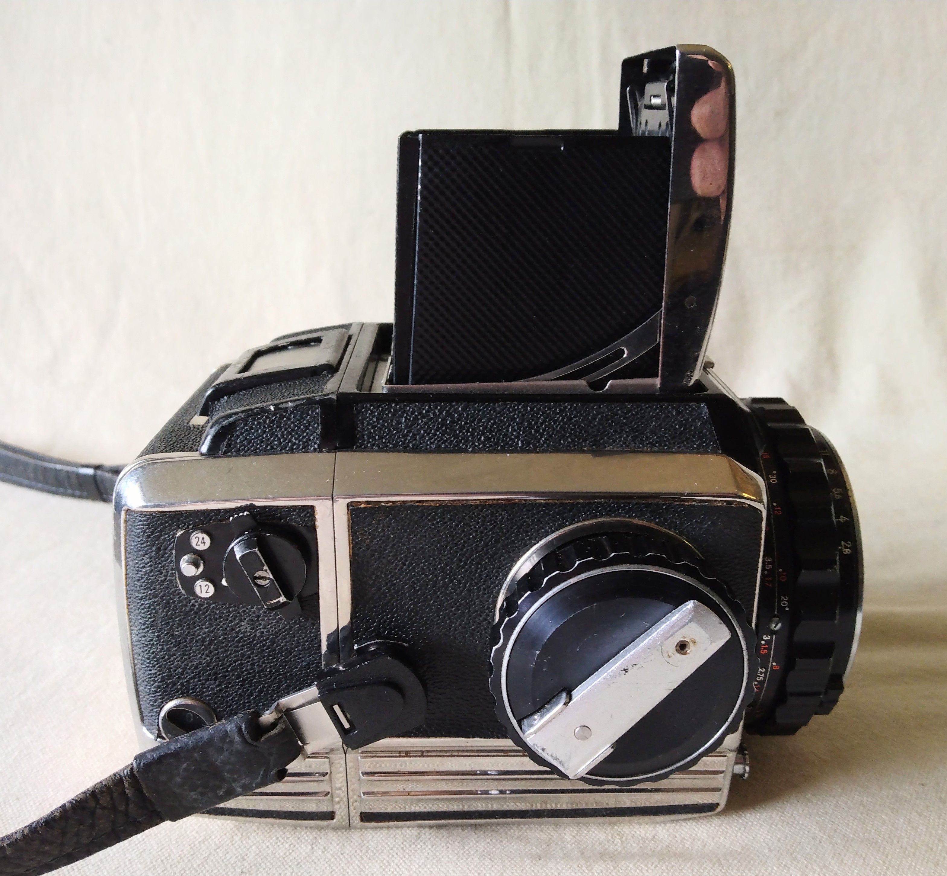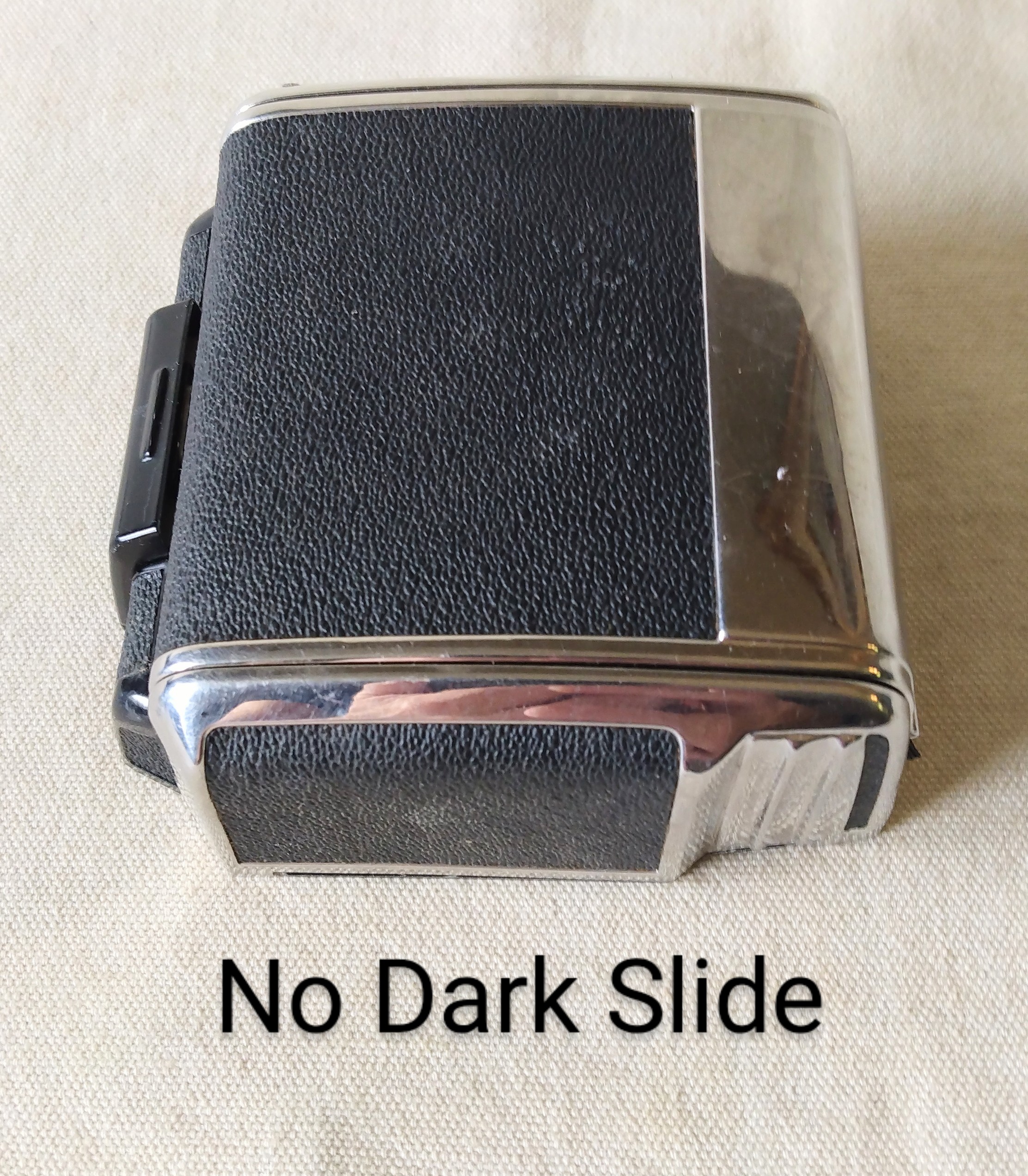- Two (2) 120 film backs; only one has a dark slide, and you need the dark slide to remove the back from the body!
