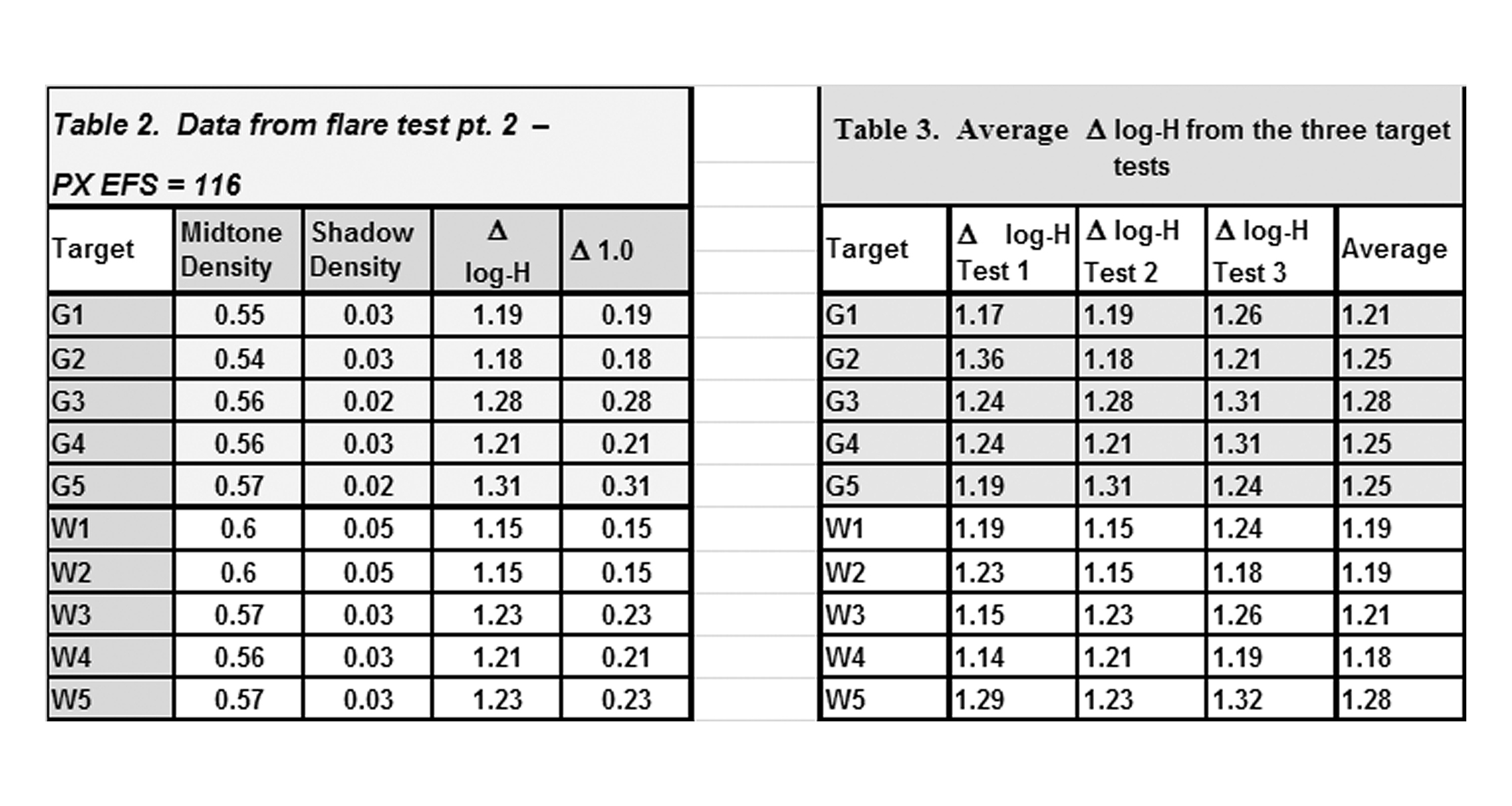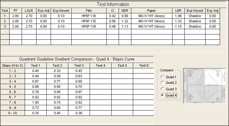 The table on the right shows the results of the second test. There's a small shift in W1 and W2 due to the f/stop getting nudged. For each of the targets it has the density at the metered exposure point, the density after stopping down four stops, the log-H difference between the two densities (this checks whether there is a four stop difference between the two points), and the far right column shows the log-H difference between the Zone I exposure and 0.10 over film base plus fog.
